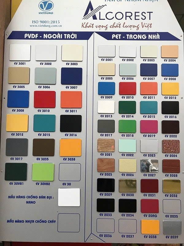 – Lớp nhôm bên ngoài: Bên ngoài được phủ sơn PE (nội thất), PVDF (ngoại thất) và sử dụng màng keo phân tử bám vào lõi nhựa cực kỳ chắc chắn.