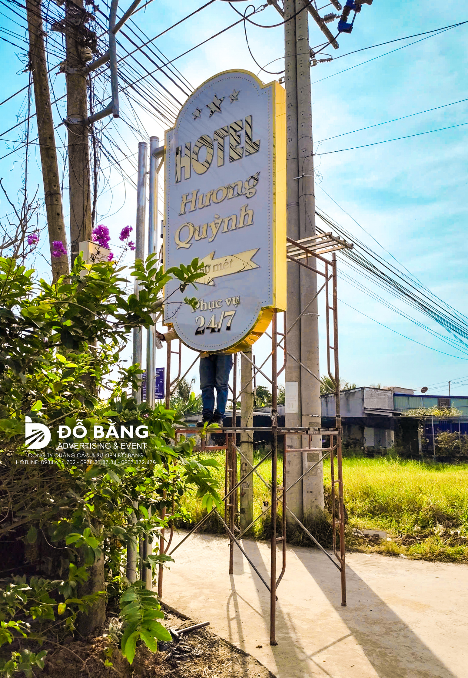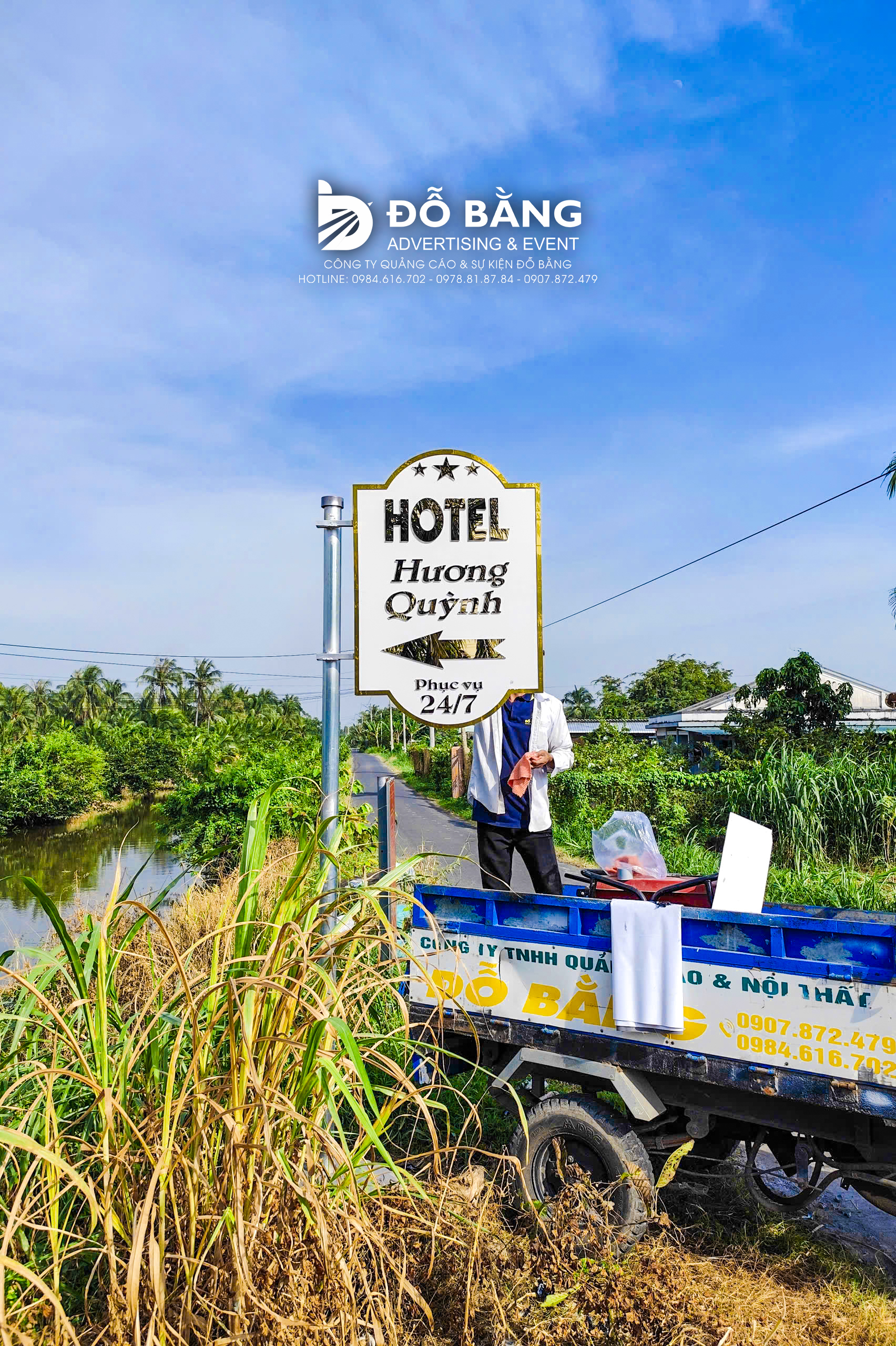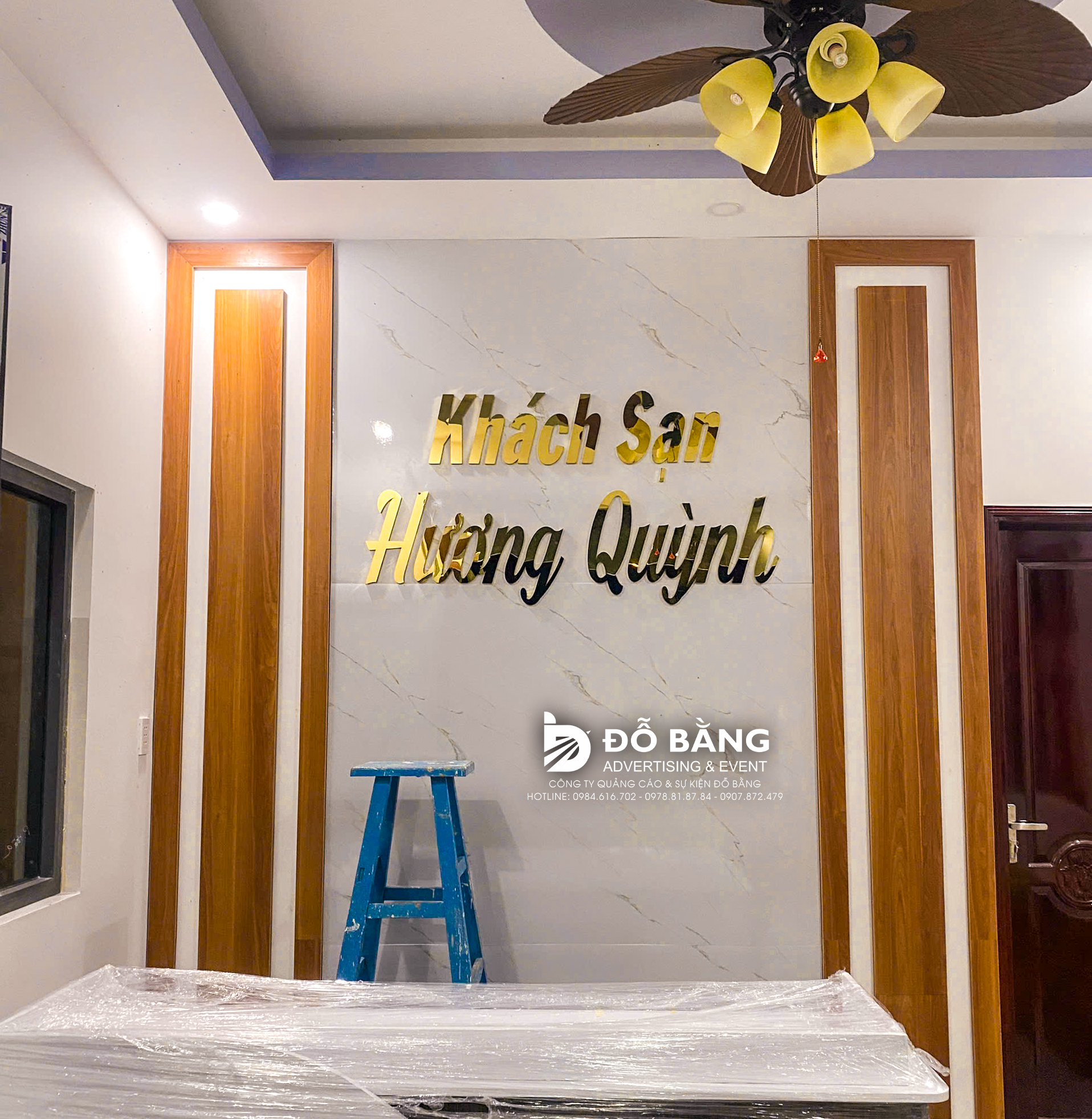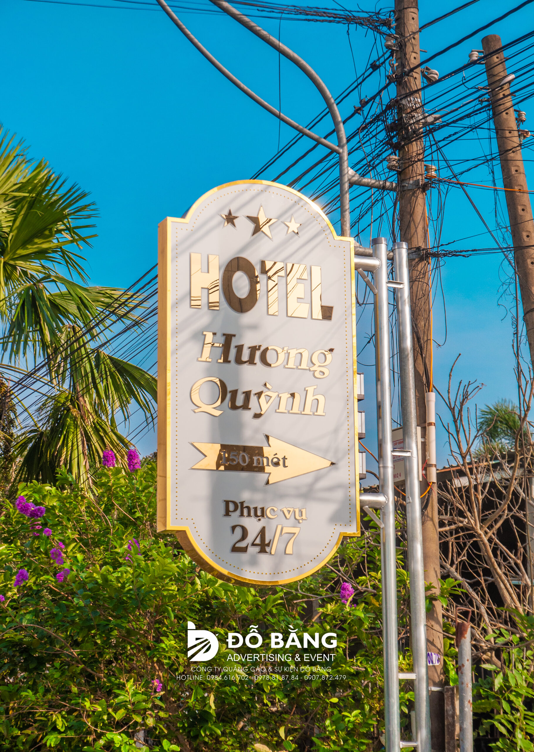 Bước chân đến khách sạn Hương Quỳnh, khách hàng sẽ ngay lập tức bị thu hút bởi sự đồng bộ và chỉn chu trong từng bảng biển. Tại cổng chính, tên khách sạn được gia công bằng chất liệu Inox vàng gương lộng lẫy, đặt trang trọng trên nền vân đá nhằm tôn vinh sự quyền quý và đẳng cấp của thương hiệu.